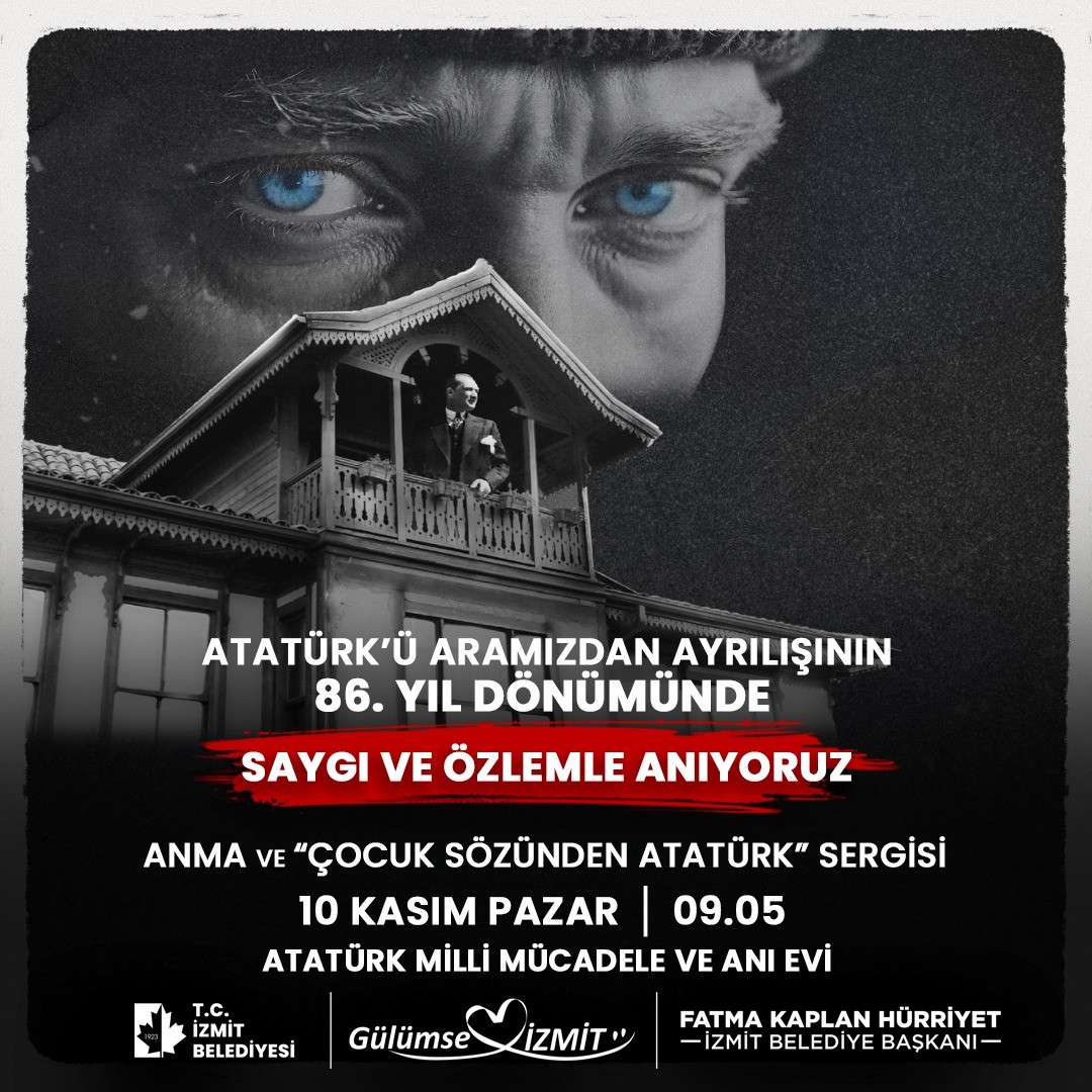 İzmit Belediyesi, 10 Kasım Pazar günü (Yarın) Türkiye’nin Türkiye Cumhuriyeti’nin kurucusu Mustafa Kemal Atatürk için Atatürk ve Milli Mücadele Anı Evi’nde anma programı gerçekleştirecek