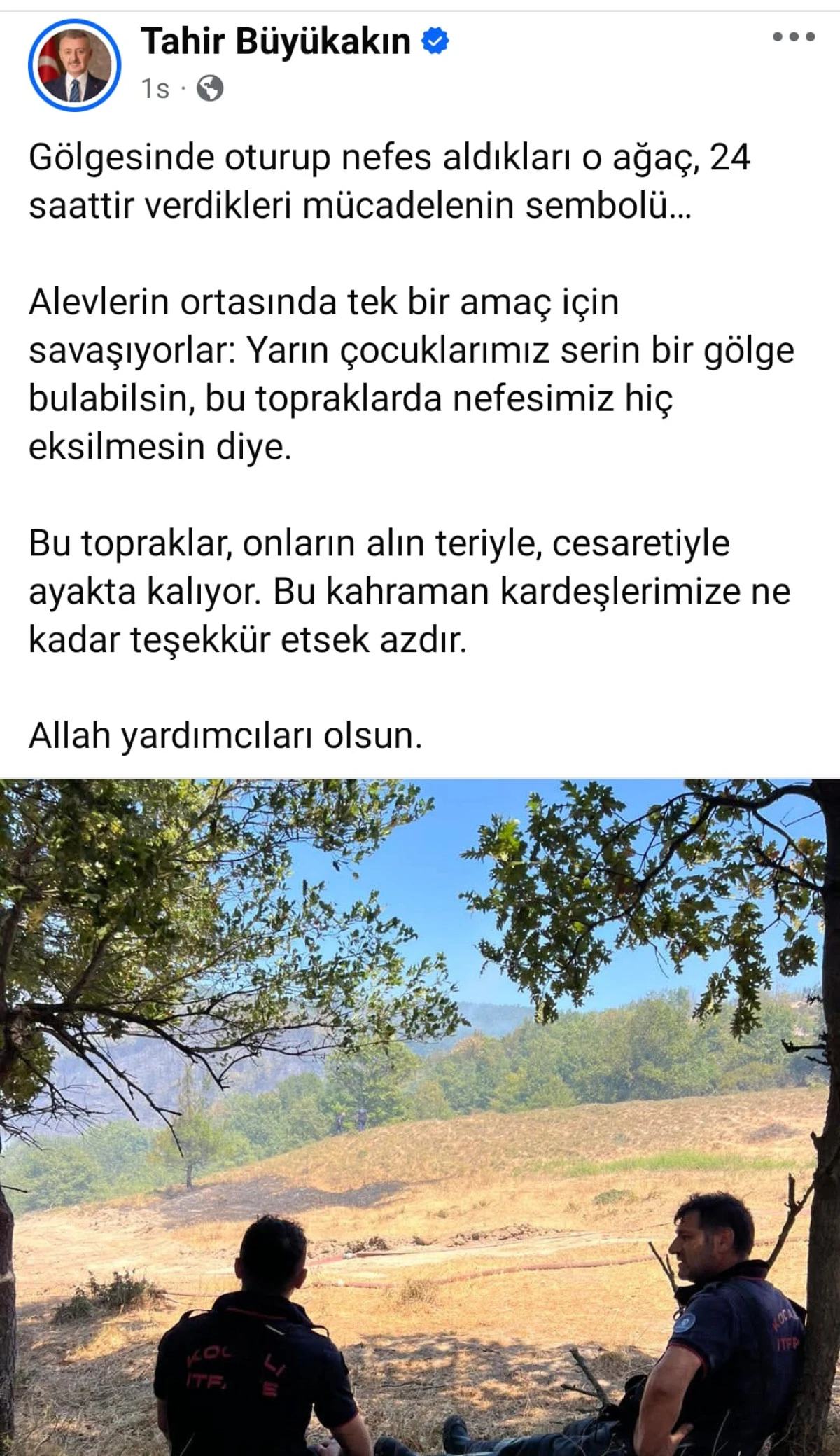 Gölgesinde oturup nefes aldıkları o ağaç, 24 saattir verdikleri mücadelenin sembolü... Alevlerin ortasında tek bir amaç için savaşıyorlar: Yarın çocuklarımız serin bir gölge bulabilsin, bu topraklarda nefesimiz hiç eksilmesin diye. Bu topraklar, onların alın teriyle, cesaretiyle ayakta kalıyor. Bu kahraman kardeşlerimize ne kadar teşekkür etsek azdır. Allah yardımcıları olsun." Başkan Tahir Büyükakın'ın paylaştığı fotoğraf sosyal medyada büyük ilgi gördü.
