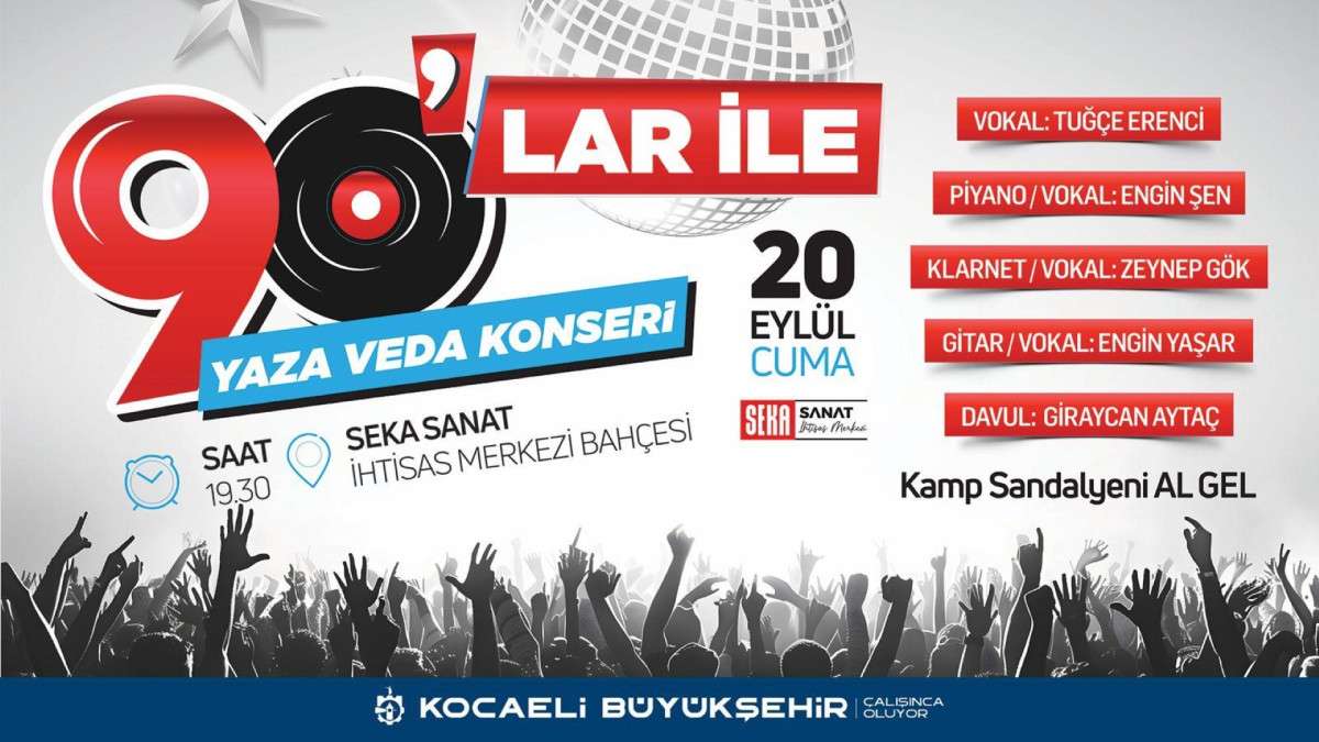 Kocaeli Büyükşehir Belediyesi, 20 Eylül Cuma akşamı “90’lar ile Yaza Veda” konseri düzenleyecek. “Kamp sandalyeni al gel” çağrısıyla düzenlenecek konser, Büyükşehir Belediyesi’nin SEKA Havzası içindeki SEKA Sanat ve İhtisas Merkezi’nin bahçesinde gerçekleştirilecek.