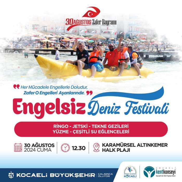 30 Ağustos Zafer Bayramı kutlamaları kapsamında Kocaeli Büyükşehir Belediyesi ile Kent Konseyi iş birliğinde Karamürsel Altınkemer Halk Plajı’nda Engelsiz Deniz Festivali gerçekleştirilecek. 30 Ağustos Cuma günü saat 12.30’da başlayacak festivale 12 ilçede faaliyet gösteren 46 dernekten 3 bin özel gereksinimli vatandaşın katılması bekleniyor. Bu yıl 4. kez düzenlenecek deniz festivalinde muz, stand up paddle, ringo, kano turu, jet turu, tekne turu ve yüzme etkinliklerinden faydalanacak engelli bireyler aileleri ile birlikte eğlence dolu güzel bir gün geçirecek. Festivalde plajların engelsiz hale getirilerek, engelli bireylerin denize erişimlerinin kolaylaştırılması hedeflenirken engellilerin can güvenliği en üst seviyede tutulacak. Cankurtaran ve profesyonel su sporu eğitmenleri gibi geniş bir ekibin eşlik edeceği engelli bireyler gün boyu suda çeşitli aktiviteleri deneyimleyecek.