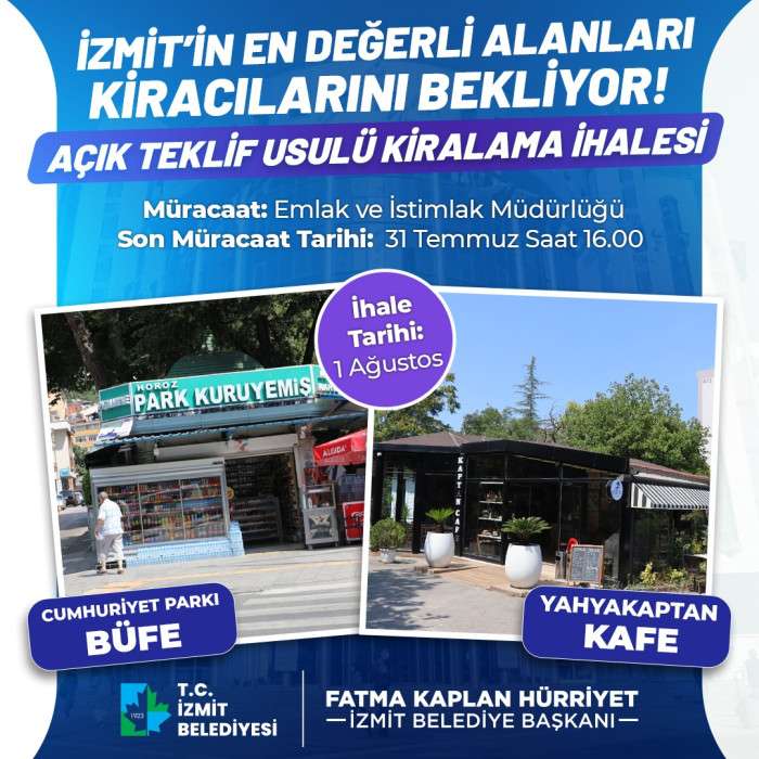 İzmit’in en işlek noktalarından biri olan Cumhuriyet Parkı Büfe’nin de içerisinde bulunduğu 25 adet taşınmaz, 1 Ağustos’ta açık teklif usulü ile kiraya çıkıyor. İhaleye katılmak isteyenlerin İzmit Belediyesi Emlak ve İstimlak Müdürlüğü Emlak İstimlak Birimi’ne müracaat ederek, en geç 31 Temmuz 2024 tarihi saat 16:00’ya kadar ihale zarflarını teslim etmeleri gerekiyor.