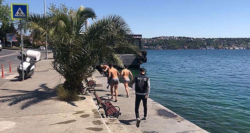Sarıyer’de tam kapanmayı ihlal ederek denize giren vatandaşlar, denetim yapan polisleri görünce kıyafetlerini giyinmeden kaçtı.
