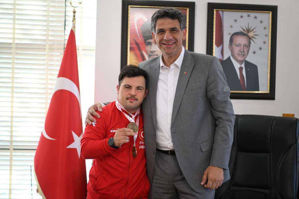 Kartepe Belediye Başkanı Mustafa Kocaman, 2. Down Sendromlular Dünya Spor Oyunları’nda şampiyon olan Doğukan Coşkun’u kabul etti.