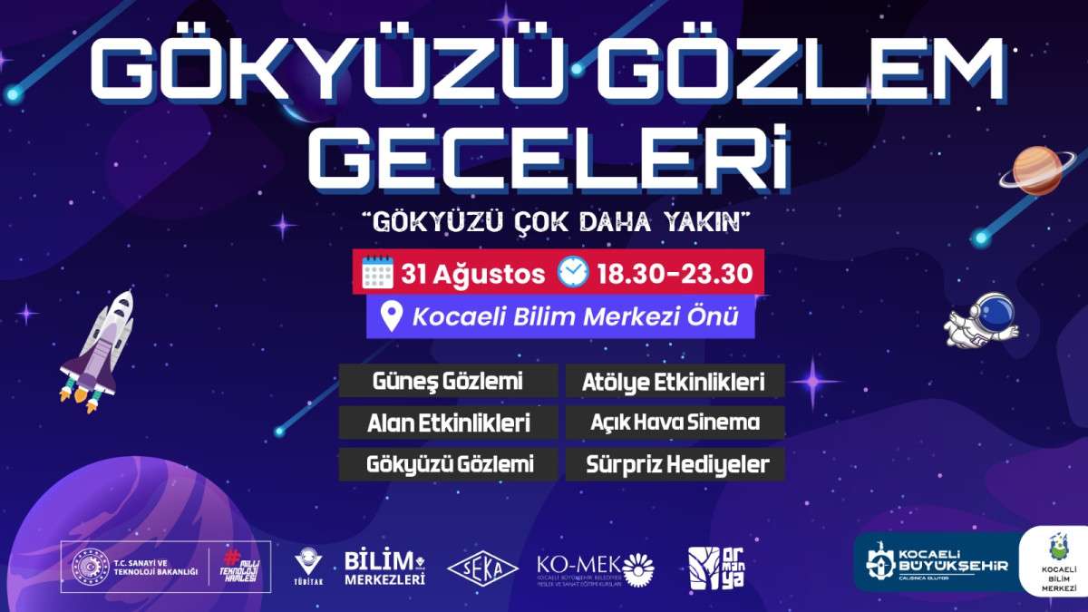 Kocaeli Büyükşehir Belediyesi Kültür ve Sosyal İşler Dairesi Başkanlığına bağlı olarak hizmet veren Kocaeli Bilim Merkezi, her yaz döneminde gerçekleştirdiği Gökyüzü Gözlem Geceleri etkinliğine hazırlanıyor. Toplumda bilimsel kavramları ve yapıları tanıtarak, öğretmeyi ve bu alana olan ilgiyi artırmayı hedefleyen Kocaeli Bilim Merkezi, etkinliklerini devam ettiriyor. Bu kapsamda 31 Ağustos 2024 Cumartesi günü Kocaeli Bilim Merkezi’nde 18.30-23.30 saatleri arasında “Gökyüzü Gözlem Geceleri” etkinliği gerçekleşecek.