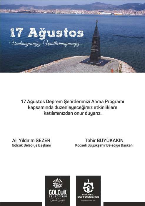Gölcük Belediyesi, Asrın Felaketi 17 Ağustos Gölcük Depremi’nin 25.yılına özel anma programı, 16 Ağustos Cuma günü saat 10.00-16.00 arasında Kazıklı Kervansaray’da düzenlenecek Afetlerde Sağlık Hizmetleri konulu seminer ile başlayacak. Her yıl olduğu gibi Kavaklı Sahili’nde devam edecek program; saat 21.00’da Kuran-ı Kerim tilaveti ve dualar ile başlayacak. Deprem şehitlerinin dualar ile anılmasının ardından program protokol konuşmaları ve Gölcük Arama Kurtarma Ekibi - GESOTİM’in sertifika töreni ile devam edecek.