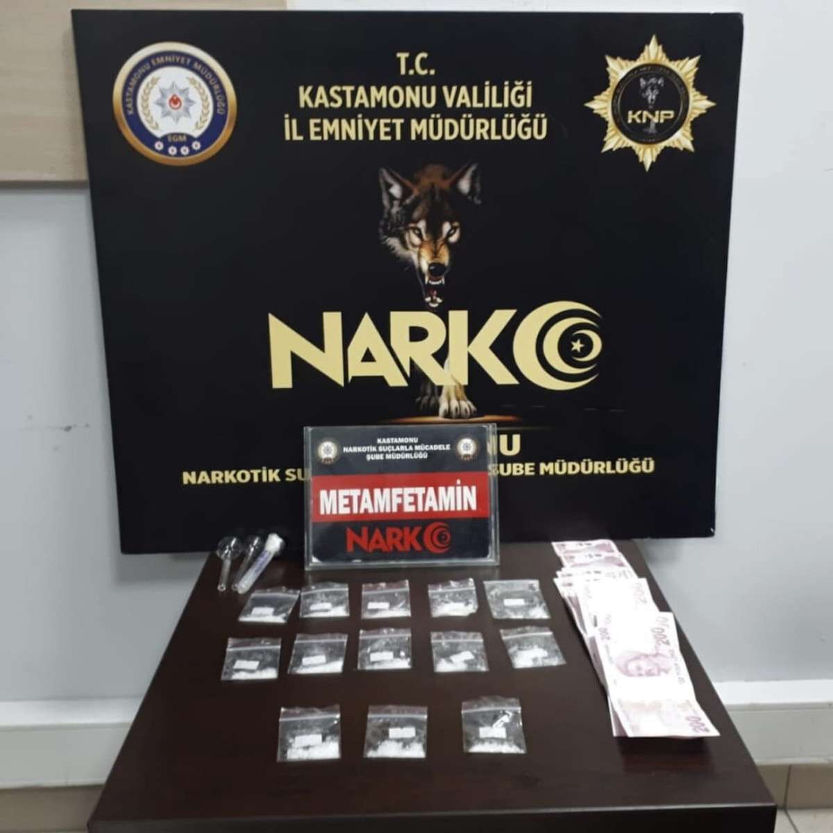Edinilen bilgiye göre, Kastamonu İl Emniyet Müdürlüğü Narkotik Suçlarla Mücadele Şube Müdürlüğü ekipleri tarafından, durdurulan bir araçta ve iki şahsın üstünde arama yapıldı. Aramada 4,64 gram metamfetamin, 3 adet uyuşturucu içiminde kullanılan cam düzenek ile suçtan elde edildiği değerlendirilen 3 bin TL nakit para ele geçirildi.Olayla ilgili yakalanan A.B. işlemlerinin ardından adliyeye sevk edildi. Hakim karşısına çıkartılan şahıs tutuklandı.
