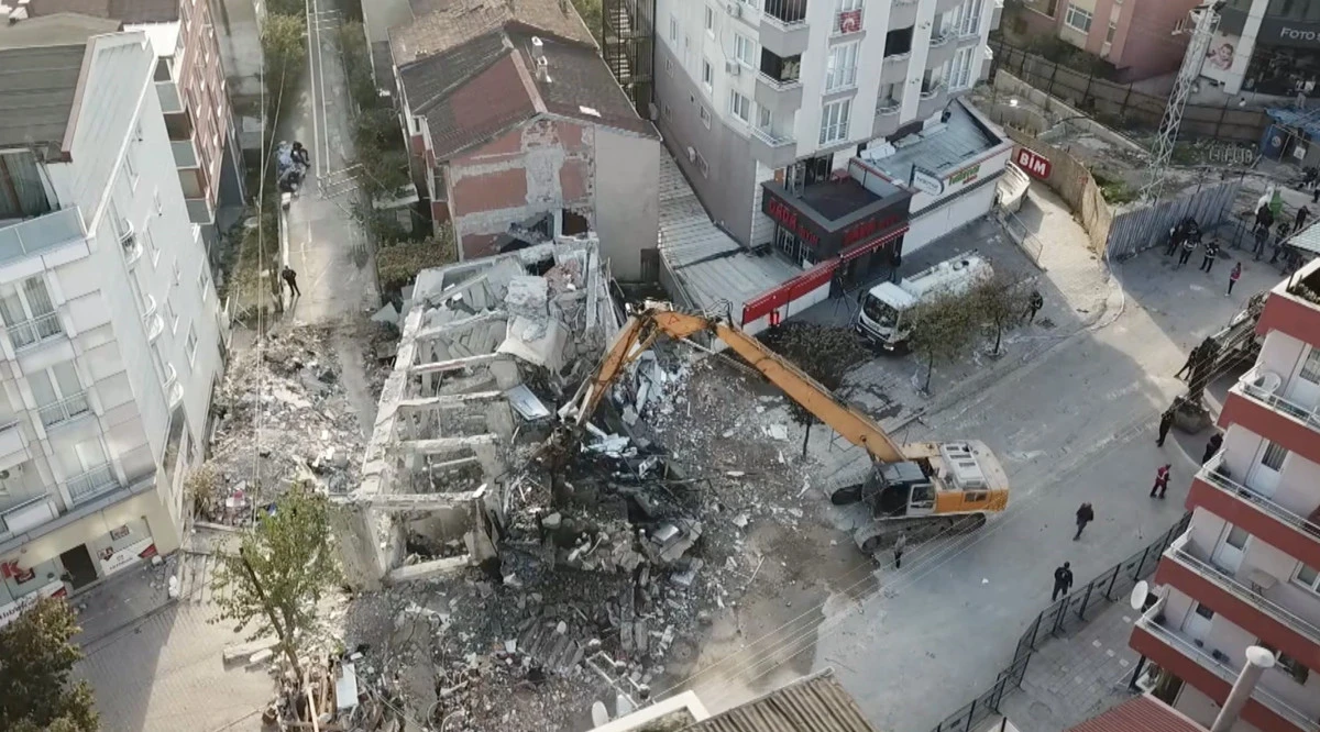 Kocaeli'nin Gebze ilçesinde 4 kişiye mezar olan 7 katlı binanın enkazının kaldırılması için çalışma başlatıldı. Yapılan çalışmalar dronla görüntülendi.