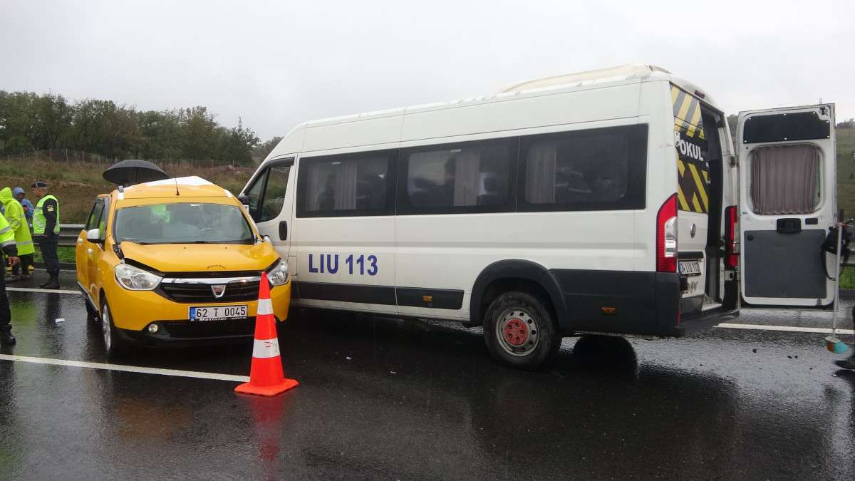 Kuzey Marmara Otoyolu Kocaeli geçişinde işçileri taşıyan servis minibüsü ile ticari taksinin çarpışması neticesinde meydana gelen kazada 13 kişi yaralandı. c