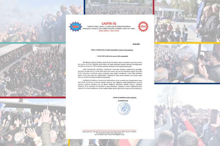 Bilindiği gibi Lastik-İş Sendikası olarak Pirelli, Prometeon, Brisa ve Goodyear işverenlerine birer yazı yazmış ve ek zam talebinde bulunmuştuk. Bu talebin gerekçesi herkesin yakından hissettiği geçim zorluklarının artması ve TÜİK tarafından açıklanan enflasyon oranına güvenilmemesiydi. Lastik işverenleriyle sürdürülen müzakereler sonucunda ücretlerin iyileştirilmesi gerektiğini işverenler de kabul etti ve 1 Ocak 2023 tarihli ücret zammı için yeni bir düzenleme yapıldı. Buna göre Pirelli, Prometeon ve Brisa’da çalışan sendikamız üyesi işçilerin ücretlerine 1 Ocak 2023 tarihinden geçerli olmak üzere %30 zam uygulanacaktır. Üyelerimizin Ocak ayında alacakları zam farkları Şubat 2023 ayı ücretleri ile birlikte kendilerine ödenecektir. Sendikamızın talebine ve üyelerimizin beklentilerine önem vererek ücret iyileştirilmesini kabul eden Pirelli, Prometeon ve Brisa’ya teşekkür ediyoruz. Aynı yaklaşımın lastik sözleşmelerinin ayrılmaz parçasını oluşturan Goodyear için de geçerli olduğunun bilinmesini özellikle istiyoruz. Goodyear çalışanları da bu iyileşmeyi hak etmekte ve talep etmektedir. Goodyear’ın benzer değerlendirmeleri yaparak bir an önce sendikamızın ek zam talebine diğer işyerleri gibi olumlu cevap vermesini bekliyoruz.