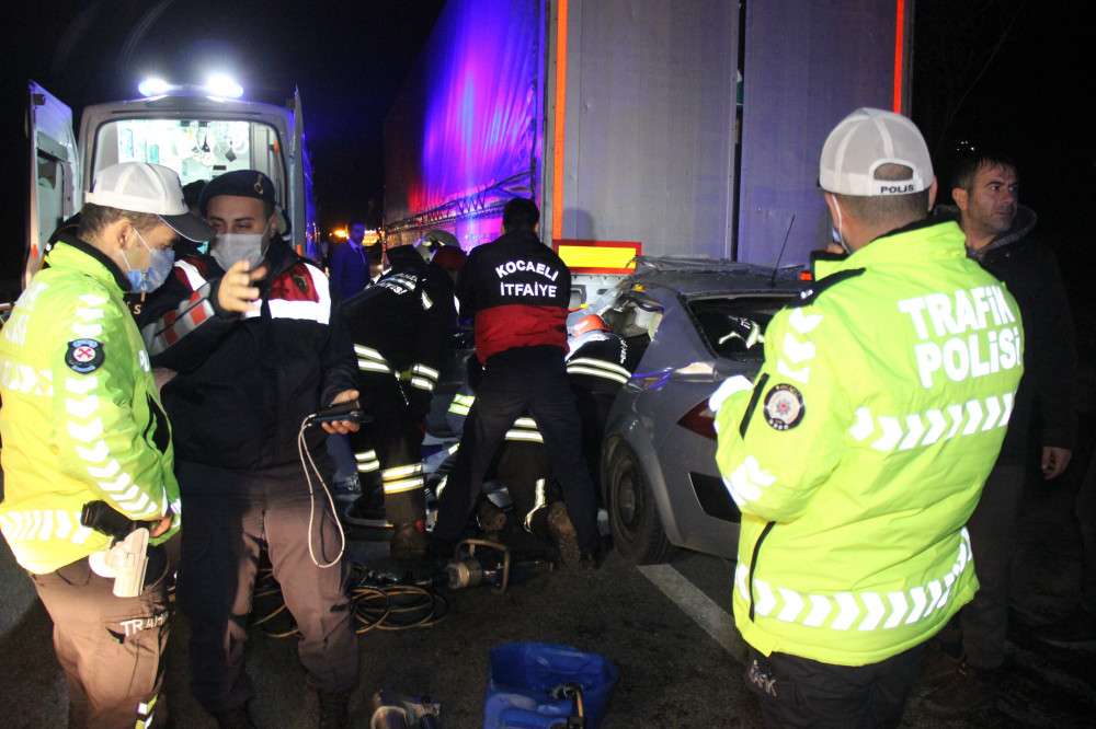 Kocaeli'nin Kartepe ilçesinde tırın dorsesine çarpan otomobil, metrelerce sürüklendi. Yarısı, dorsenin altına giren otomobilde sürücüyü kurtarmak için itfaiye ekipleri zamanla yarıştı.