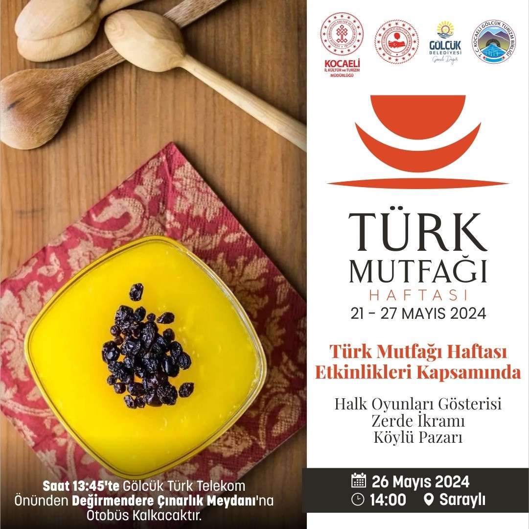 Türk Mutfağı Haftası kutlama etkinlikleri kapsamında Saraylı’da düzenlenecek kutlama; birbirinden renkli halk oyunları gösterisi sergilenecek. Etkinlik kapsamında ziyaretçilere geleneksel tatlılardan zerde ikramı yapılacak. Etkinliğe katılmak isteyenler için Gölcük Belediye otobüsleri ile 13.45'te Gölcük Telekom önünden ve Değirmendere Çınarlık meydanından ulaşım hizmeti verilecek.